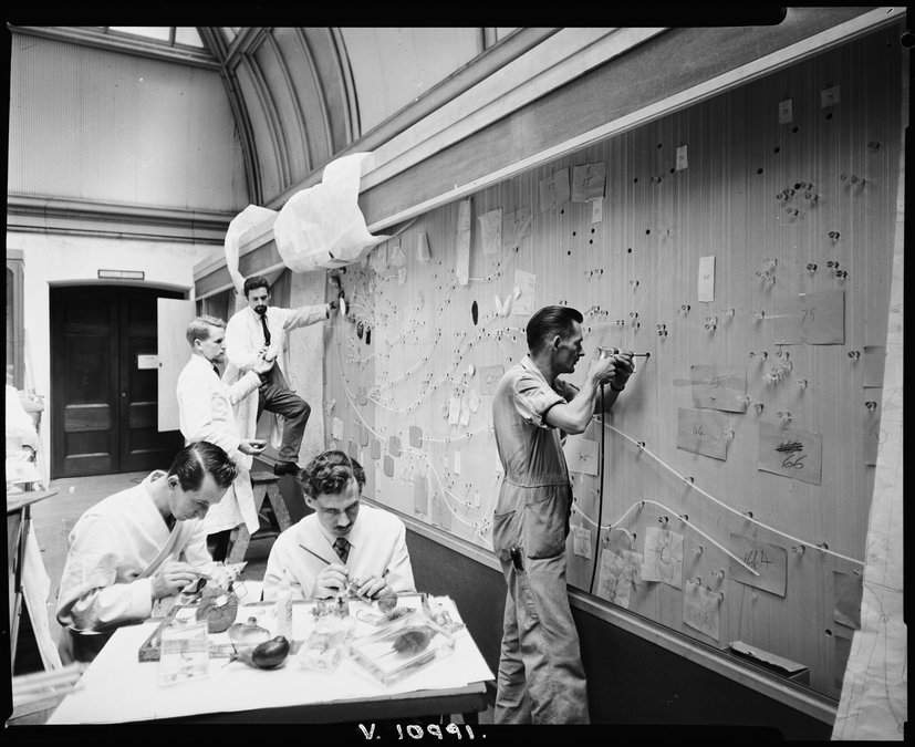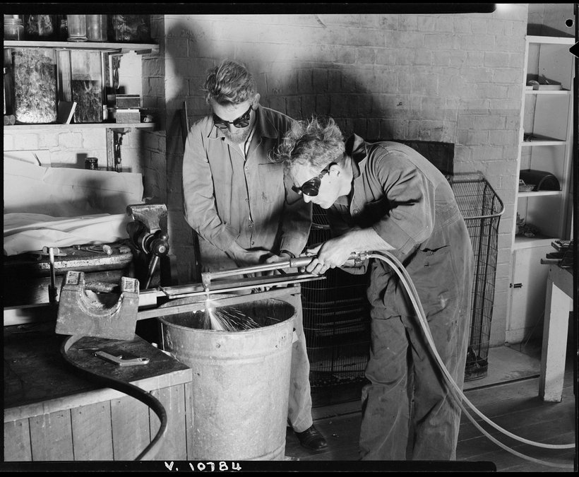 The Vertebrate Tree had a steel frame featuring fibreglass backed with 60 fluorescent tubes. Below is a photograph of artist John Beeman and David Rae constructing the metal pieces of the display. Both Beeman and Rae "attended a welding course at Sydney Technical College” to create the Tree. John began working at the Museum in 1949 and in 1956 became the head of the newly created Department of Arts and Design. There was a shift in exhibitions at the Museum. Traditional cabinets of curiosities, housing a multitude of specimens, changed to streamlined exhibitions focused on design and education. The period saw modernised exhibits described as "the most ambitious and [technically] complex displays ever installed at the Museum".