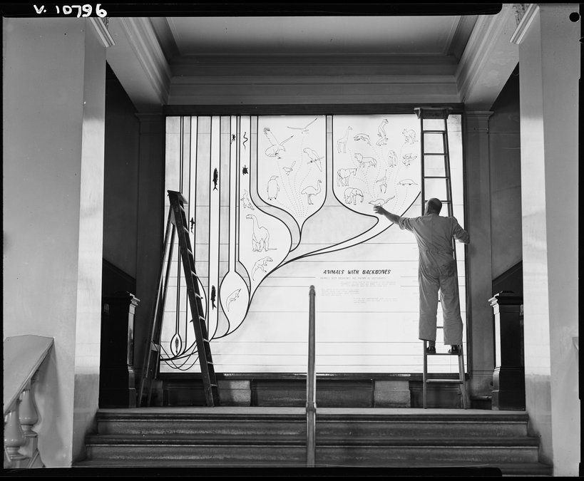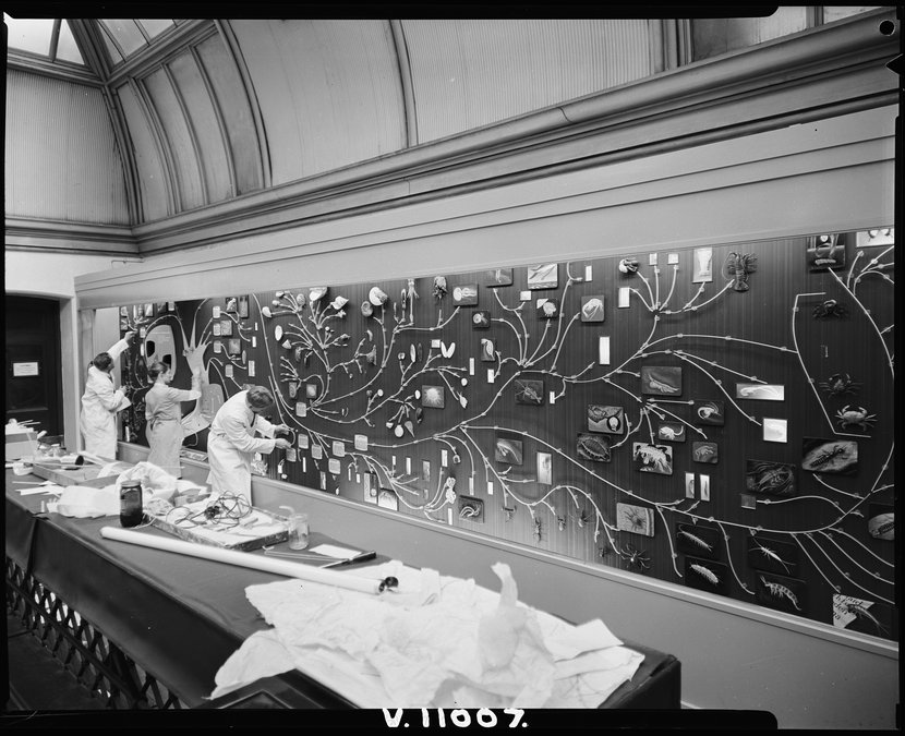 Our Australian Museum Photographic Archives hold many stories - some of our favourites, feature behind the scenes images of exhibitions at the Museum. The Vertebrate and Invertebrate Tree, both popular displays, opened in 1959 to commemorate the 100th anniversary of Charles Darwin's publication, ‘On the Origin of Species'. With the help of past Australian Museum annual reports and magazines we are able to research the story behind the displays.
